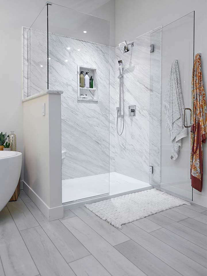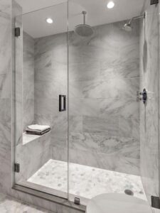 Frameless glass showers are a popular option for their clean, open look that makes small bathrooms feel more spacious. Curbless showers are ideal for accessibility, offering a seamless entry with no step or threshold—perfect for aging-in-place or mobility-focused designs. For those looking to maximize space, corner walk-in showers are a great solution that combines efficiency with elegance.
